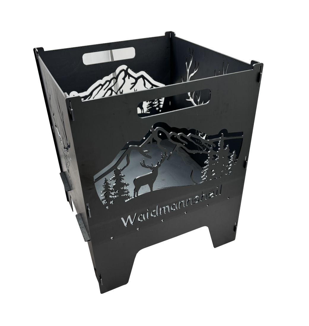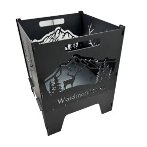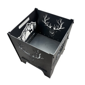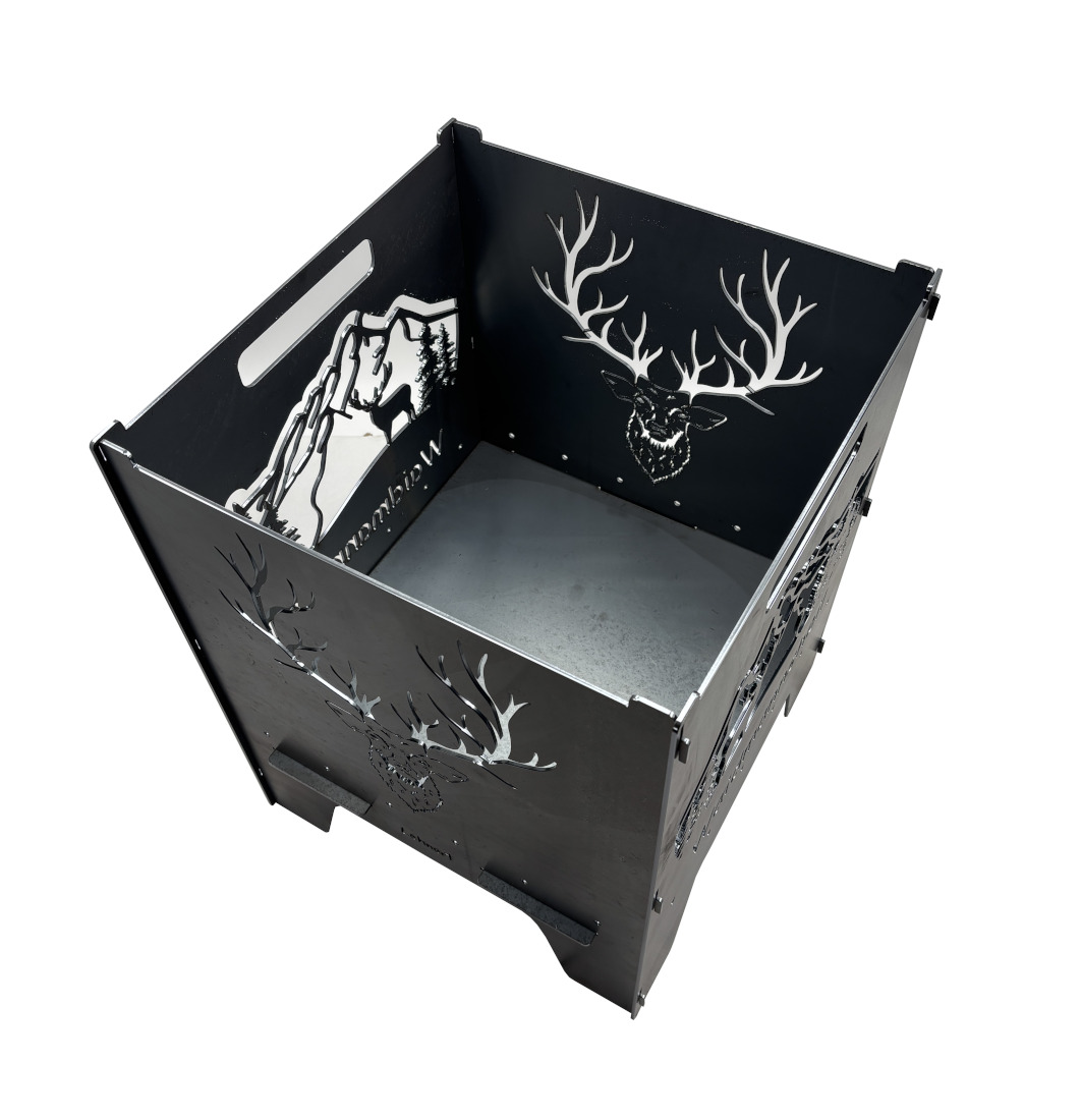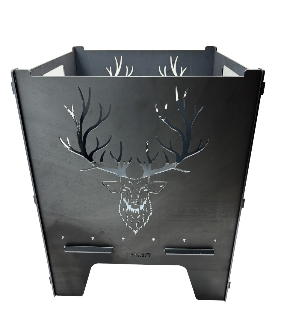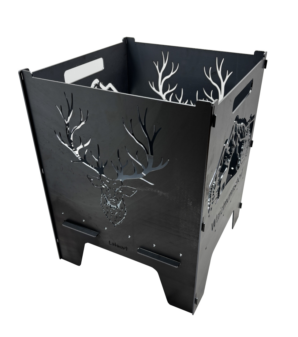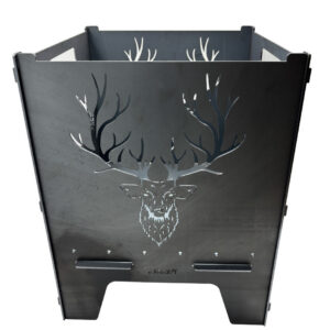 Die Feuertonne „Hirsch“ hat zwei Motive die sich auf der gegenüberliegenden Seite spiegeln. Einmal der Hirschkopf und die Landschaft mit Hirsch.