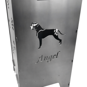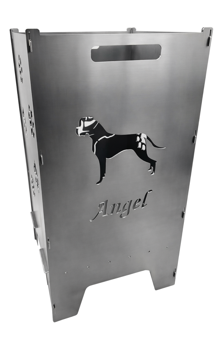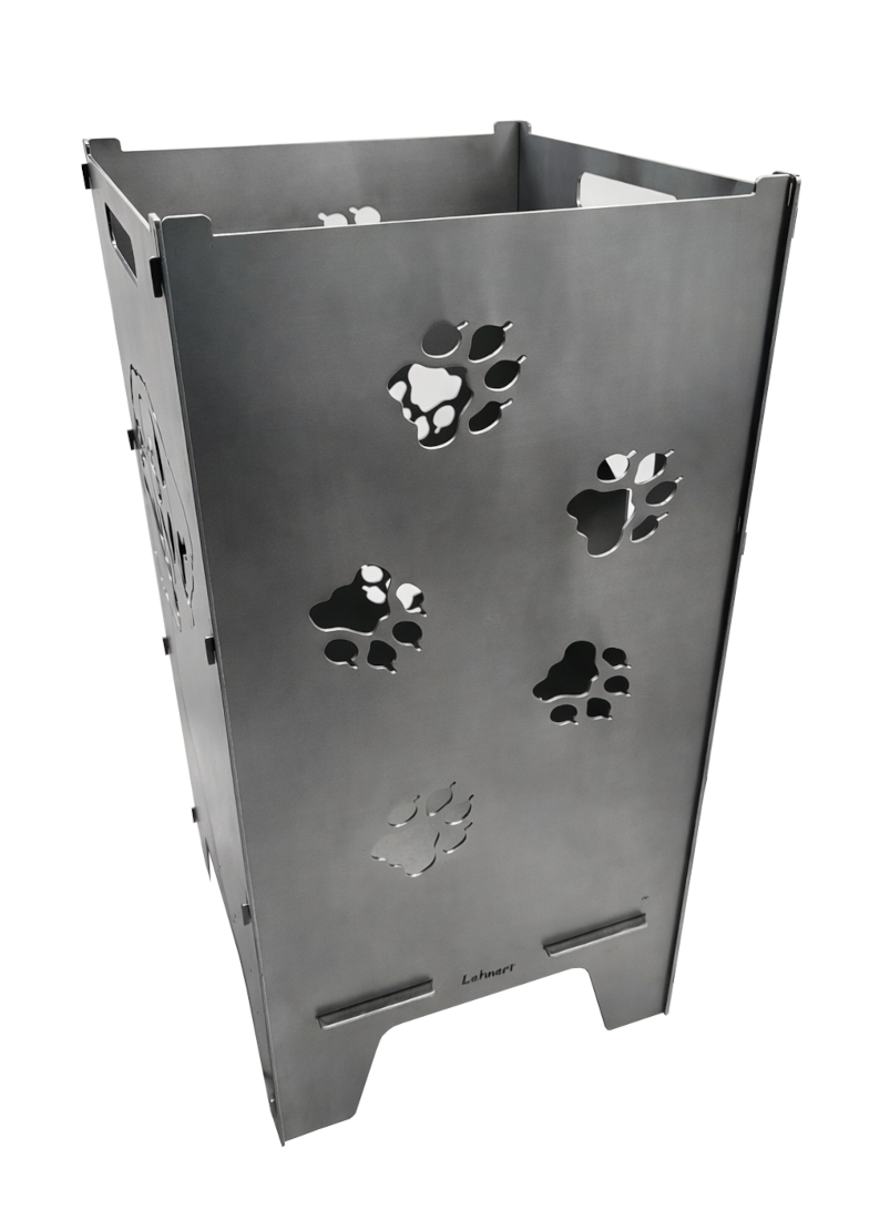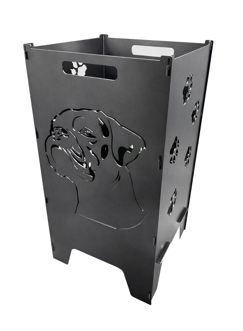 Die Feuertonne „Boxer“ hat drei Motive bei der sich zwei Motive auf der gegenüberliegenden Seite spiegeln (Pfoten). Einmal der Boxerkopf und der Boxer mit Text.